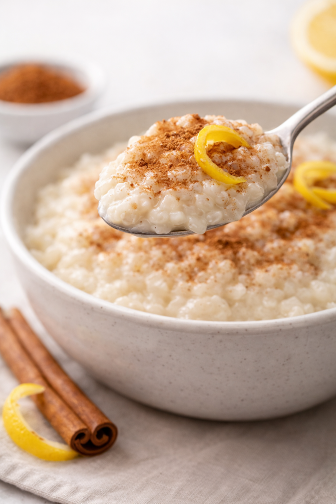 Arroz con leche de coco sin azúcar, cremoso y aromático con canela y limón.