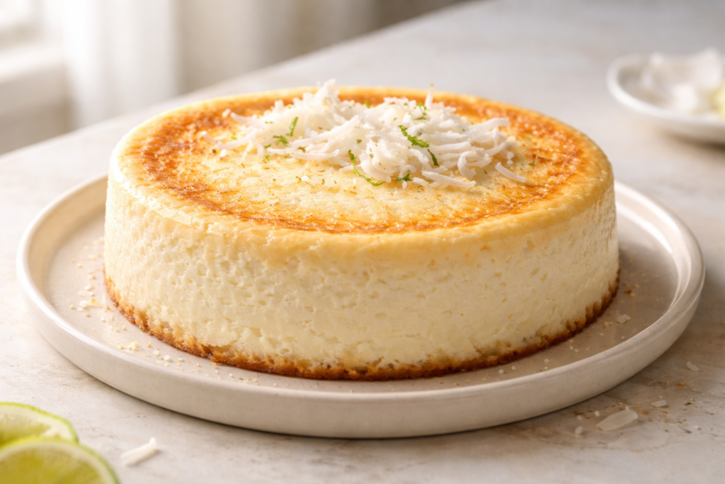 Tarta de queso y coco sin base de galleta, cremosa y ligera. Receta fácil con 4 ingredientes, lista en 25 min de horno + nevera.