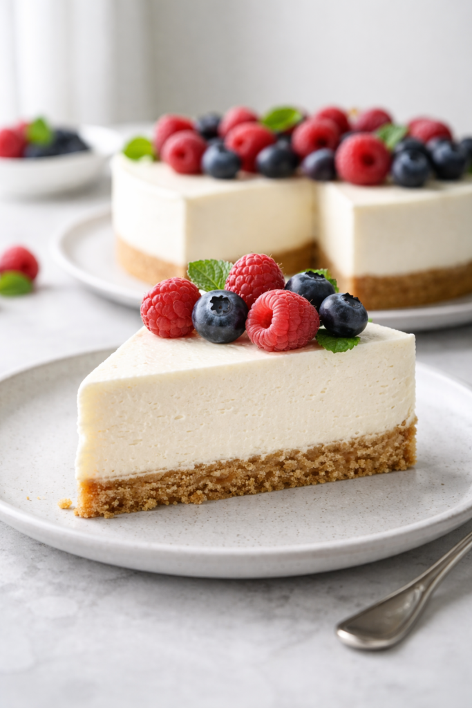 Vierte la mezcla sobre la base, alisa la superficie y refrigera 4–6 horas (mejor de un día para otro). Decora con frutos rojos antes de servir.