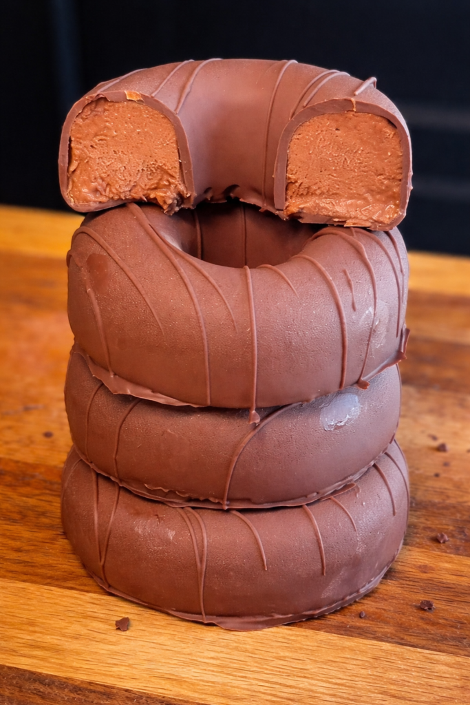 Estos donuts helados de manzana y chocolate sin azúcar son el típico postre “capricho” pero fácil: trituras, congelas y bañas en chocolate. Quedan con interior tipo mousse y una cobertura lisa con líneas de chocolate, como los de la foto.
