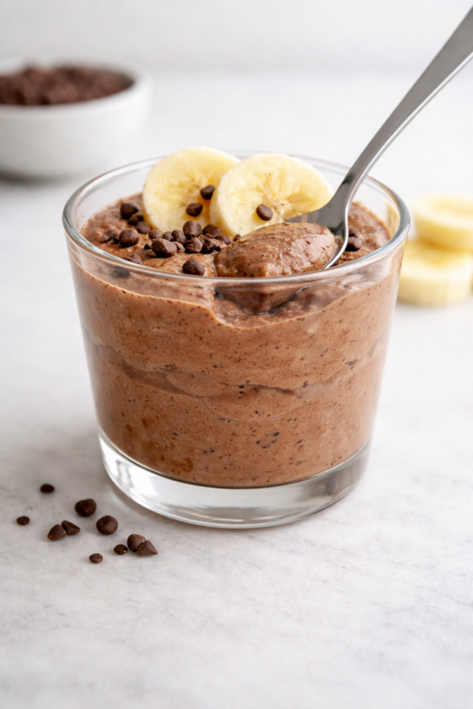 Solo necesitas plátanos maduros, cacao y yogur: lo mezclas, lo enfrías un rato y queda una crema tipo mousse súper rica.