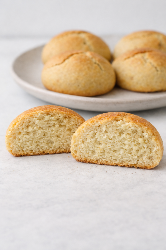 Pan keto con harina de almendras sin gluten, dorado por fuera y tierno por dentro, perfecto para panecillos o pan en molde.