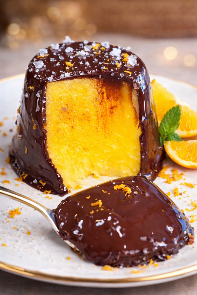 Postre de naranja con chocolate en versión mini flan: fresco, fácil y sin horno, con cobertura de chocolate negro y un toque de sal.