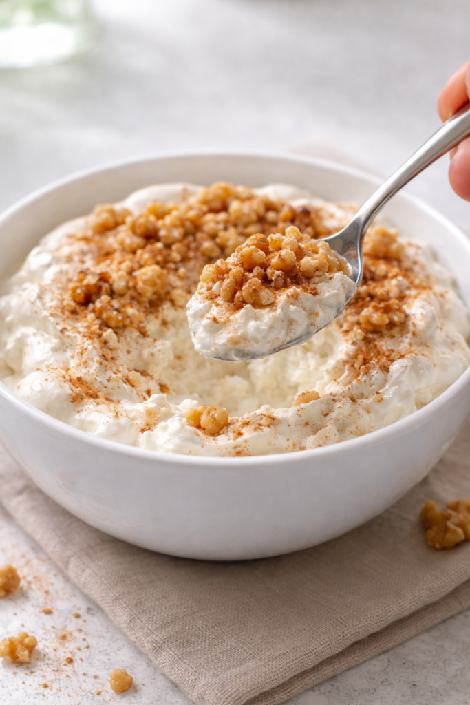 Queso fresco batido con canela y nueces: postre rápido sin azúcar y sin horno