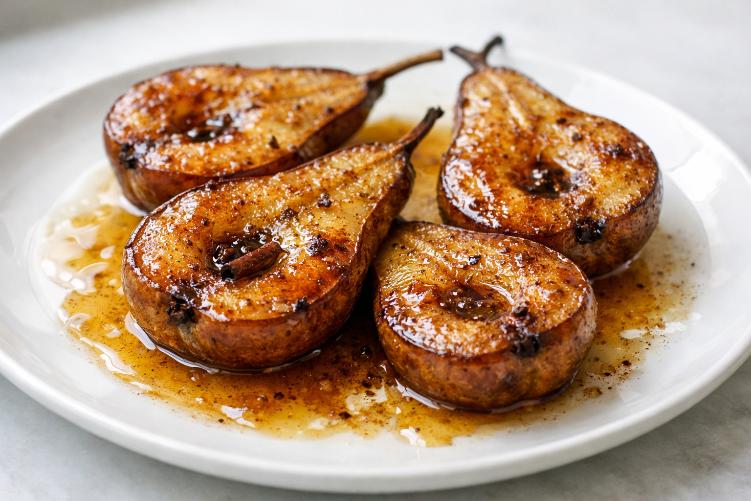 Pera asada con especias sin azúcar, al horno y súper aromática. Postre fácil con canela y jengibre, listo en 30 minutos.