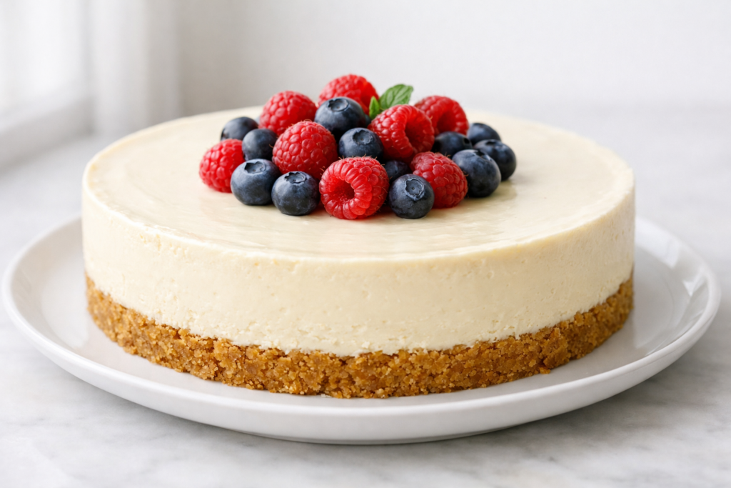 Cheesecake frío sin azúcar, cremoso y sin horno. Con base de galleta y vainilla, perfecto para preparar con antelación y decorar con frutos rojos.