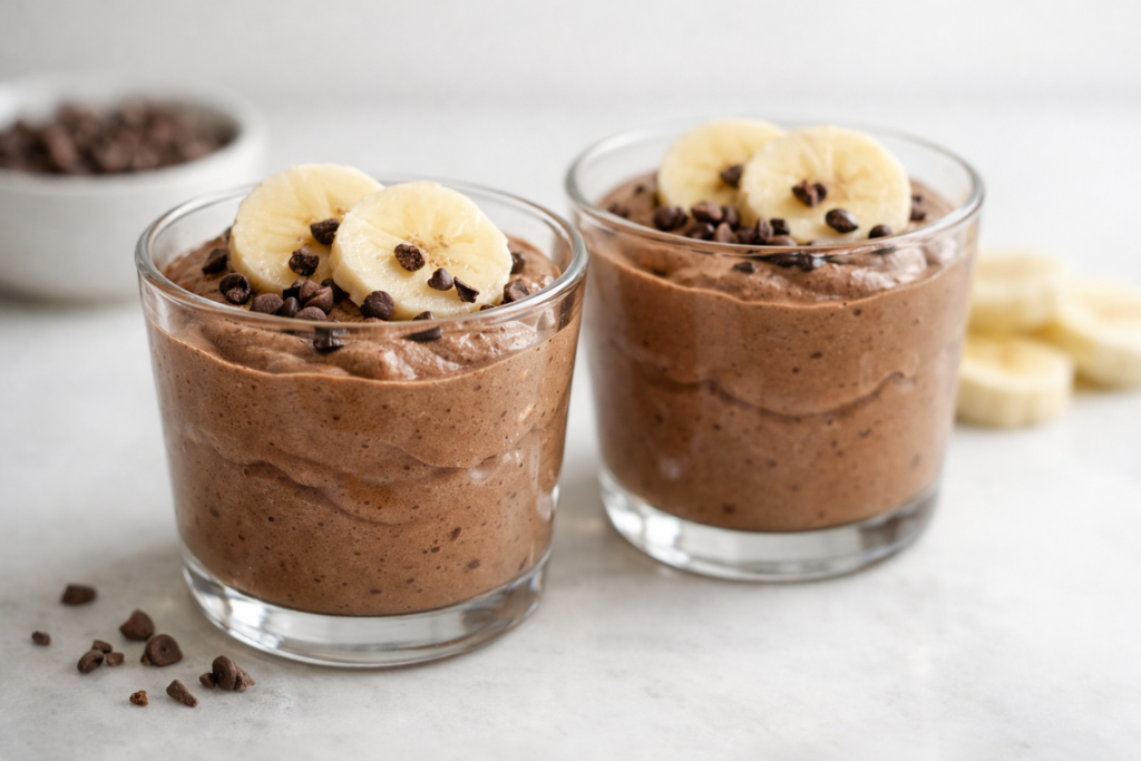 Mousse de plátano y cacao sin azúcar, cremoso y rápido. Con yogur y cacao puro, perfecto para servir en vasitos y enfriar.