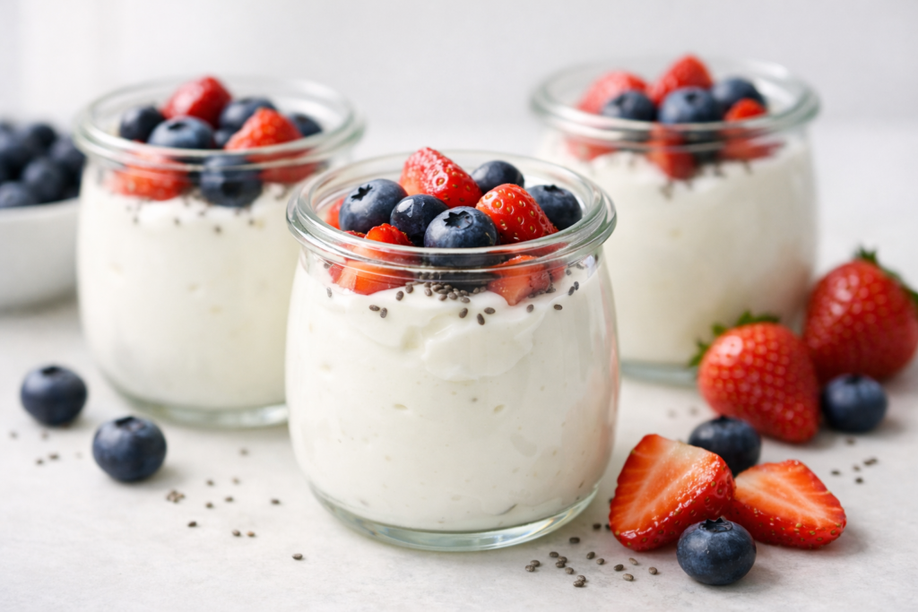 Yogur con frutas y chía sin azúcar, rápido y fresco. Listo en 10 minutos, perfecto para desayunos y meriendas saludables.