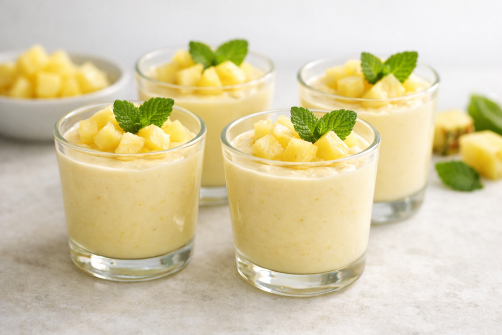 Crema fría de piña y yogur sin azúcar, fresquita y fácil. Postre en vasitos perfecto para preparar en 10 minutos y enfriar.