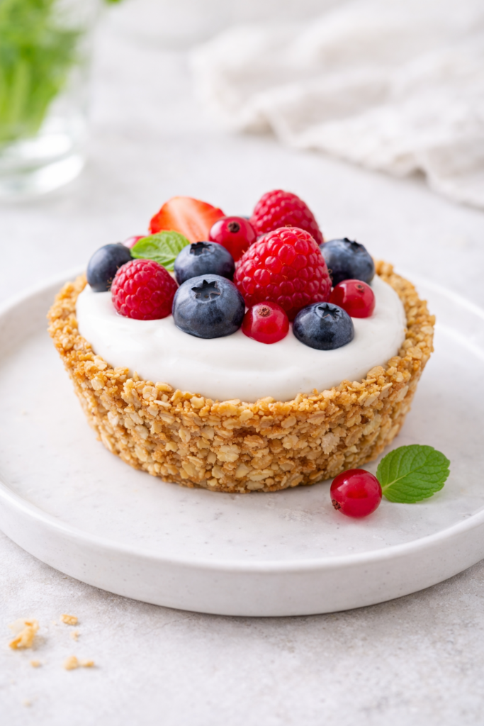 Añade el yogur natural en el centro de cada tartaleta y termina con frutos rojos por encima al gusto. Puedes usar frambuesas, arándanos, fresas troceadas o una mezcla.